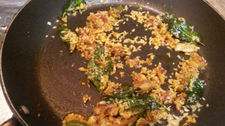 - In a pan, heat oil. Add in the mustard and once it splutters add the curry leaves and remaining chilli powder.