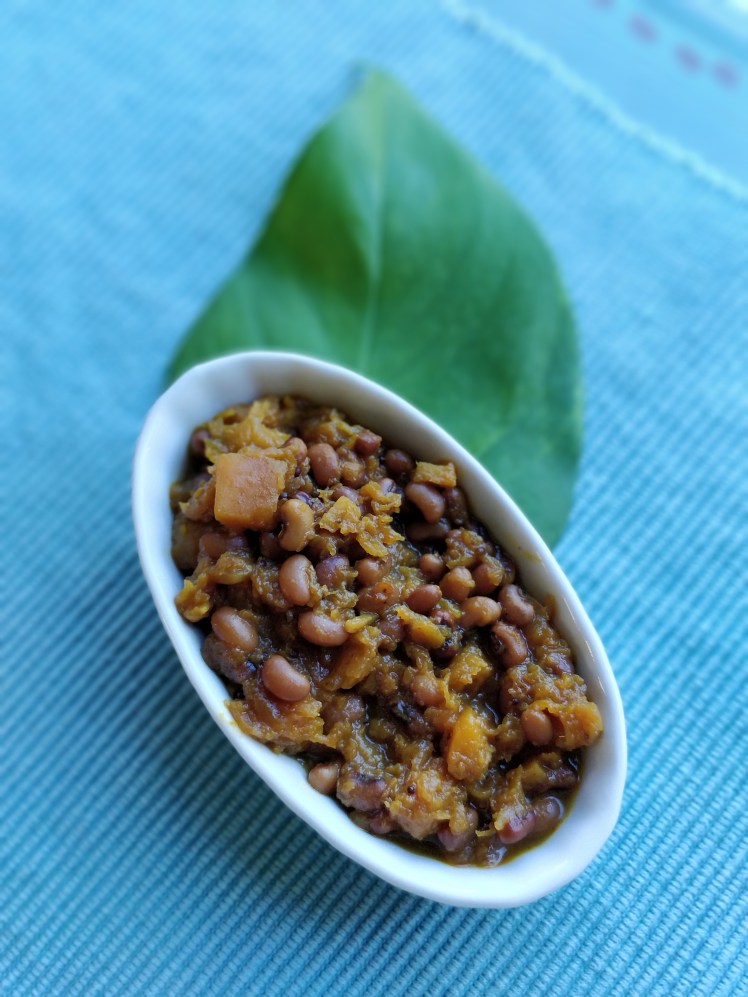 Erissery is made with pumpkin or butternut squash and vanpayaru, which is a type of small red beans. Vanpayaru resembles kidney beans, but is much smaller.