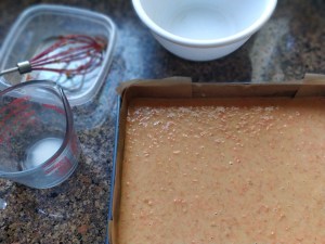 2. Grease and line a 13.5×9.5 inch pan with parchment paper